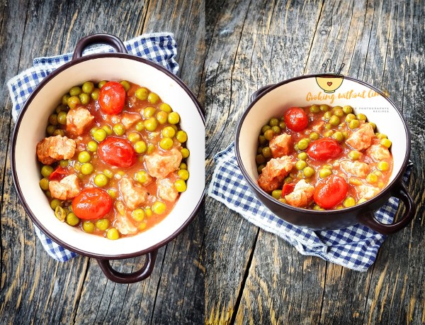 Boil the soya chunks till they are done as indicated on the bag. Chop the onion and the garlic. In a pan add olive oil and sauté the onion and the garlic. Add the soya chunks, the peas, and the vegetable stock. Let it simmer for 5 minutes. Add the mustard, cherry tomato sauce, salt, and pepper. Let it simmer for another 5 minutes.