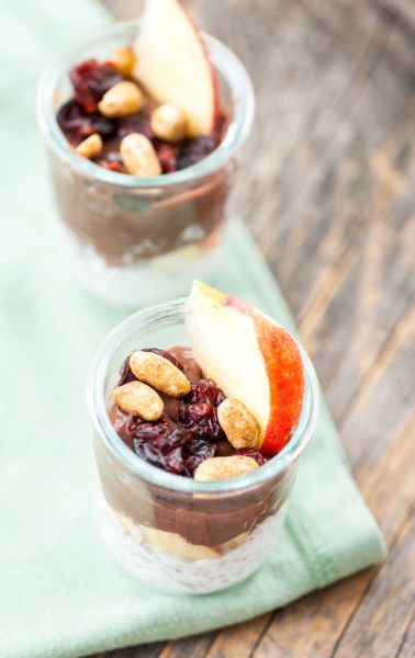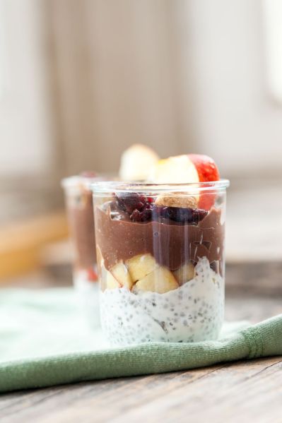 - In a glass, create layers: start with the chia seed mixture, then add apple slices, followed by a layer of chocolate pudding.